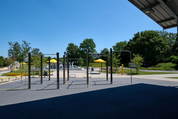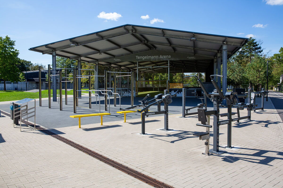 Umsetzung erster Bauabschnitt (Freilufthalle, interaktive Torwand, Streetball, Fitnessbereich)