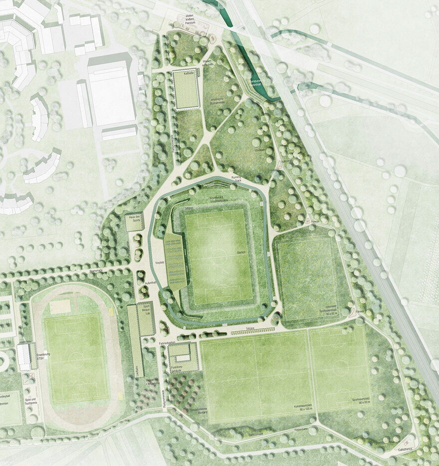 Die großflächigen Blühwiesen werden das Stadion und die Trainingsanlagen unter Berücksichtigung eines Pflegeschutzabstandes einbetten. Die Sportflächen sind kompakt zusammengefasst und in die natürliche und naturnahe neue Parkanlage eingebunden. Im Vergleich zu ähnlichen Stadien und Sportanlagen ergibt sich so eine überdurchschnittlich starke Begrünung mit umfangreichen Baum- und Gehölzpflanzungen. Beim Bau wird auf einen nachhaltigen Umgang mit den Böden geachtet.